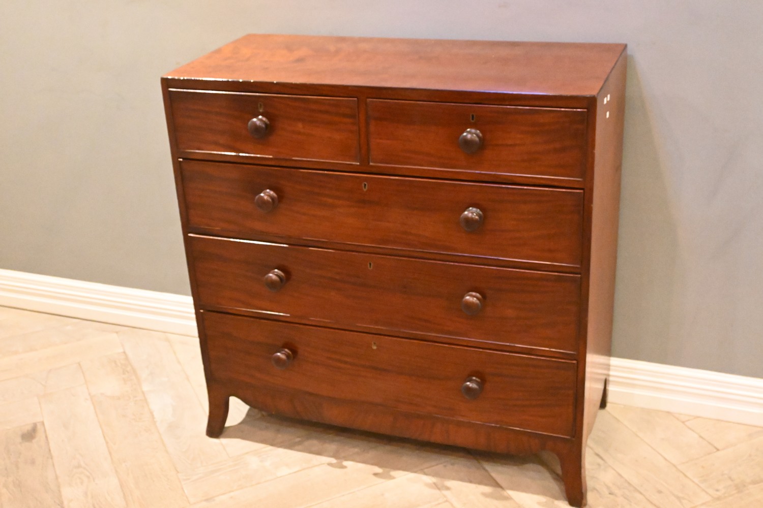 A GEORGIAN MAHOGANY FIVE DRAWER CHEST OF DRAWERS (A/F) (106H X 110W X 51D CM) (PLEASE NOTE THIS HEAVY ITEM MUST BE REMOVED BY CLIENTS OR CARRIERS AT THE CUSTOMERS EXPENSE. LEONARD JOEL STAFF CANNOT ASSIST CARRYING THIS ITEM)