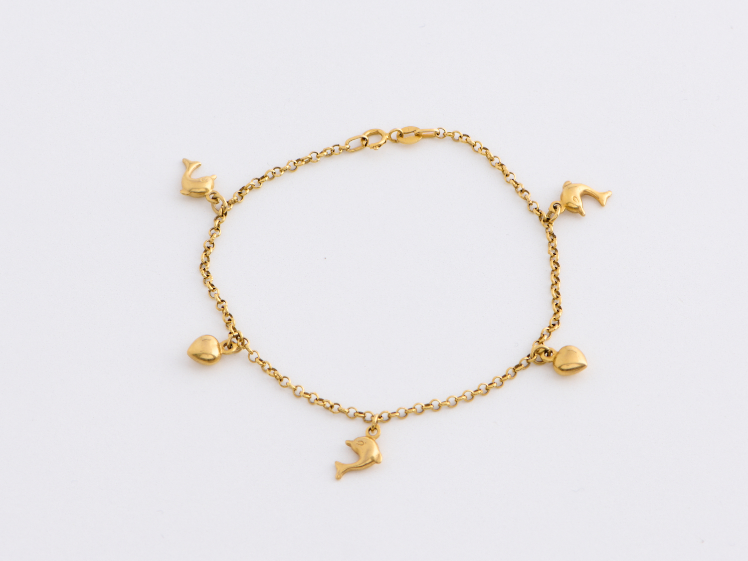 A CHARM BRACELET WITH DOLPHIN AND HEART CHARMS IN 9CT GOLD, LENGTH 200MM, 3.52GMS