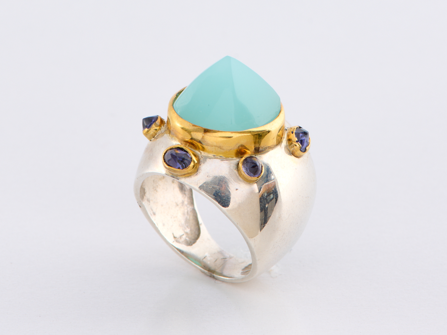 A GEMSET RING IN STERLING SILVER AND GOLD PLATE, SIZE P-Q
