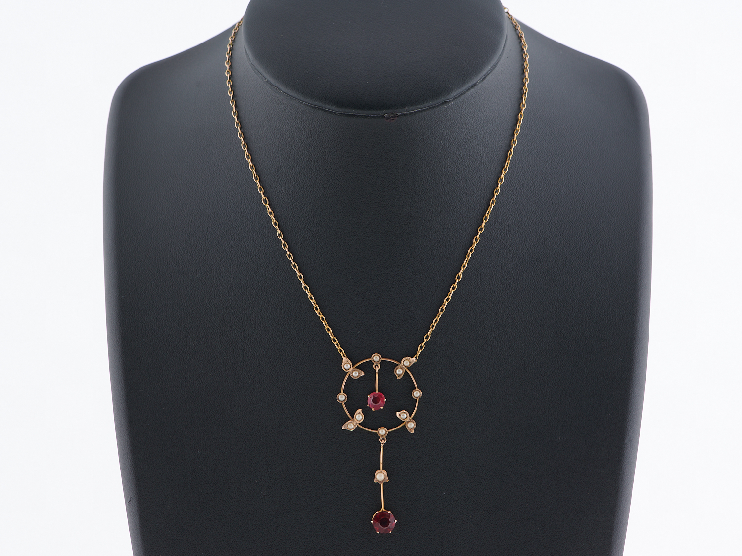 AN ANTIQUE PASTE AND SEED PEARL SET LAVALLIERE NECKLACE IN 9CT GOLD, LENGTH 390MM, 4.06GMS, WITH VALUATION
