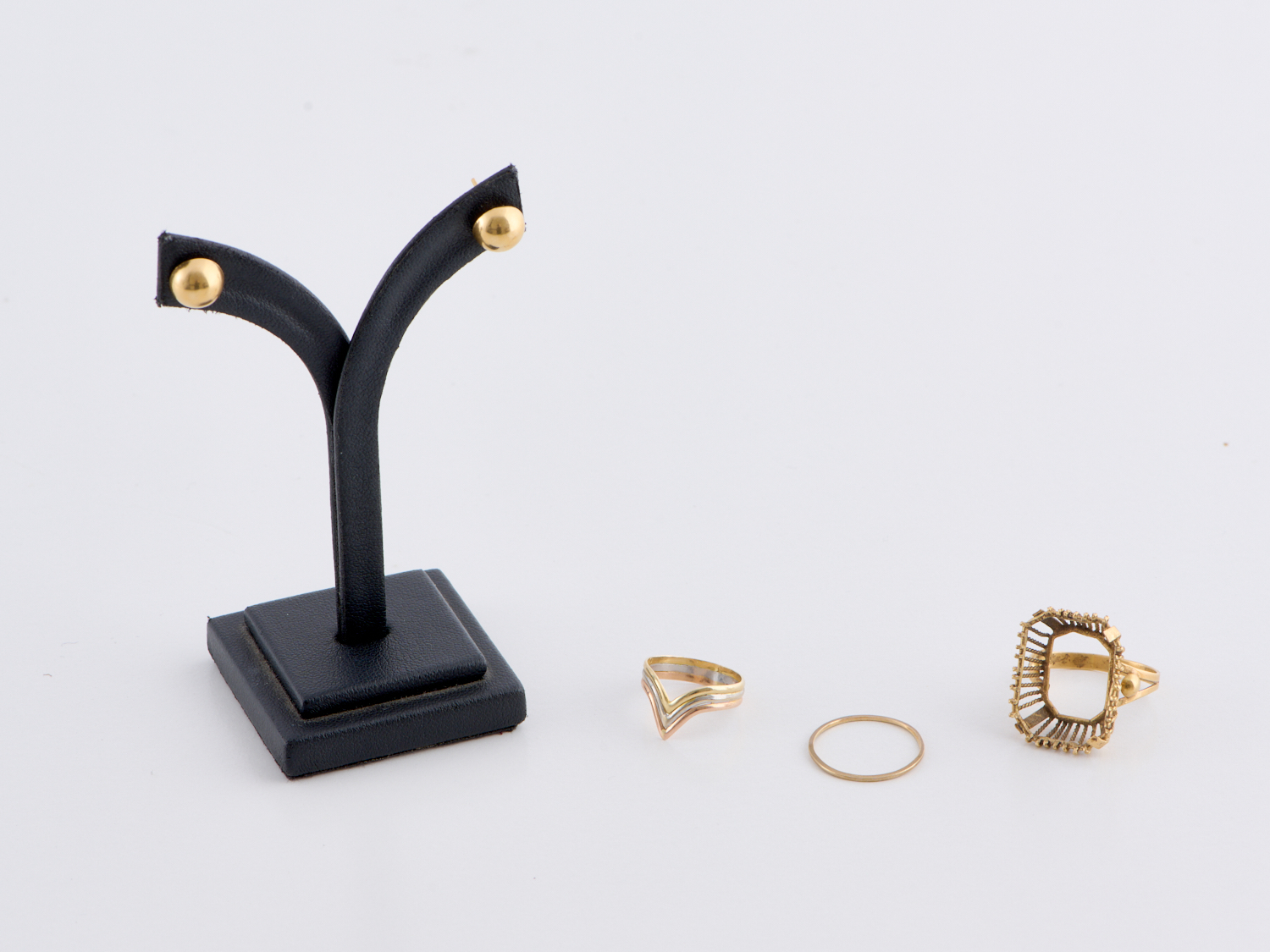 THREE GOLD RINGS, ONE IN 18CT (RING SIZE O, 4.27GMS), ONE IN 14CT TRI-COLOUR GOLD (RING SIZE I, 1.40GMS), ONE IN 9CT GOLD (RING L, 0.38GMS) AND A PAIR OF DEMI-SPHERE EARRINGS IN 18CT GOLD (1.25GMS), TO POST AND BUTTERFLY FITTINGS