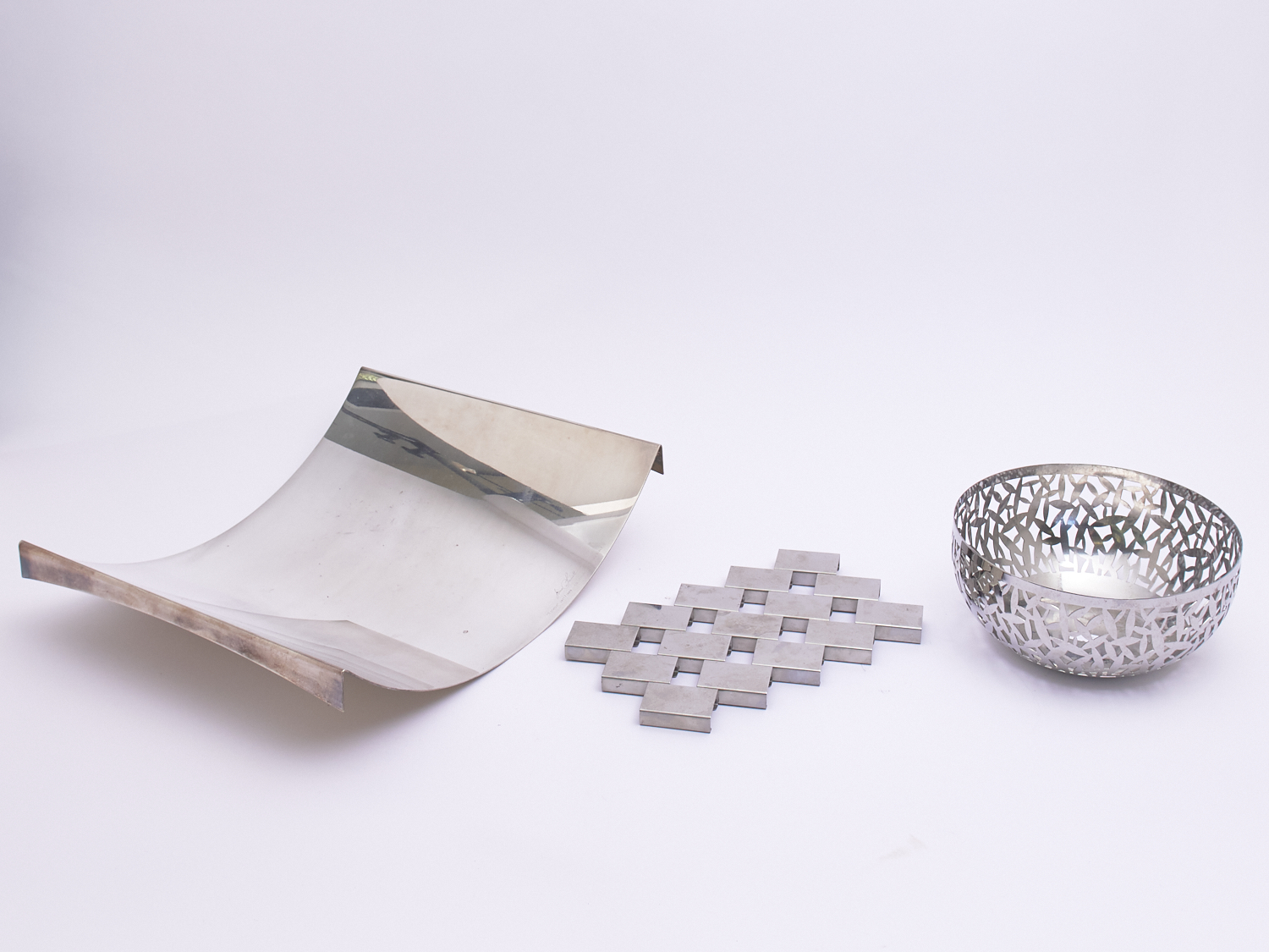A MODERN STAINLESS STEEL GROUP COMPRISING ALESSI BOWL, INOX TRIVET AND SABATTINI CENTRE PIECE W.39CM (LARGEST), LEONARD JOEL LOCAL DELIVERY: MEDIUM
