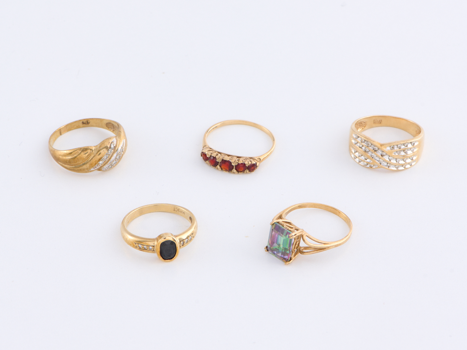 FIVE GEMSET RINGS IN 9CT GOLD, 15.2GMS