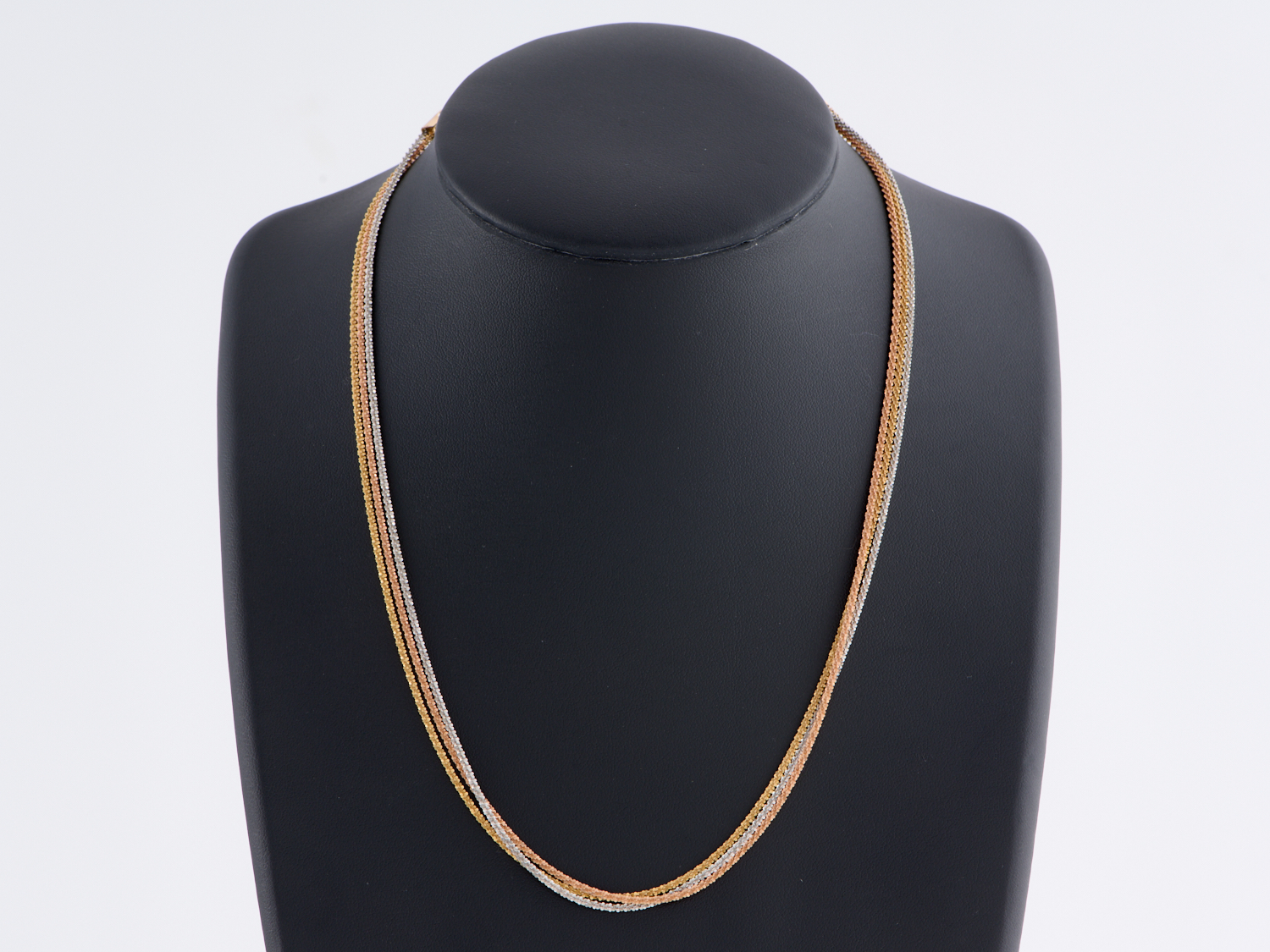 A TRI COLOURED TWIST NECKLACE IN 9CT GOLD, LENGTH 490MM, 7.8GMS