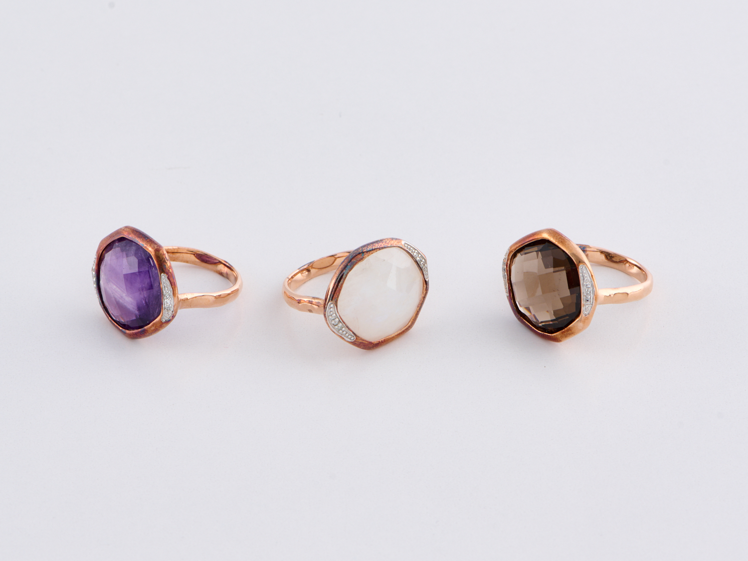 THREE GEMSET RINGS INCLUDING AMETHYST, LABRADORITE AND SMOKEY QUARTZ IN ROSE GOLD VERMEIL BY MONICA VINADER, SIZES K AND L