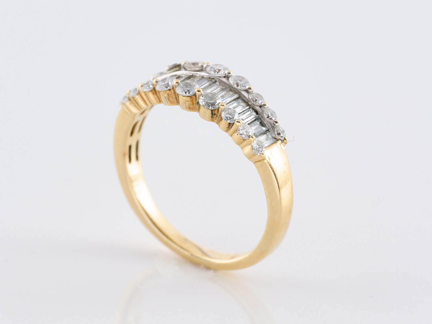AN ANTIQUE STYLE DIAMOND RING IN 18CT GOLD, RING SIZE N, THE DIAMONDS TOTALLING 1.32CTS