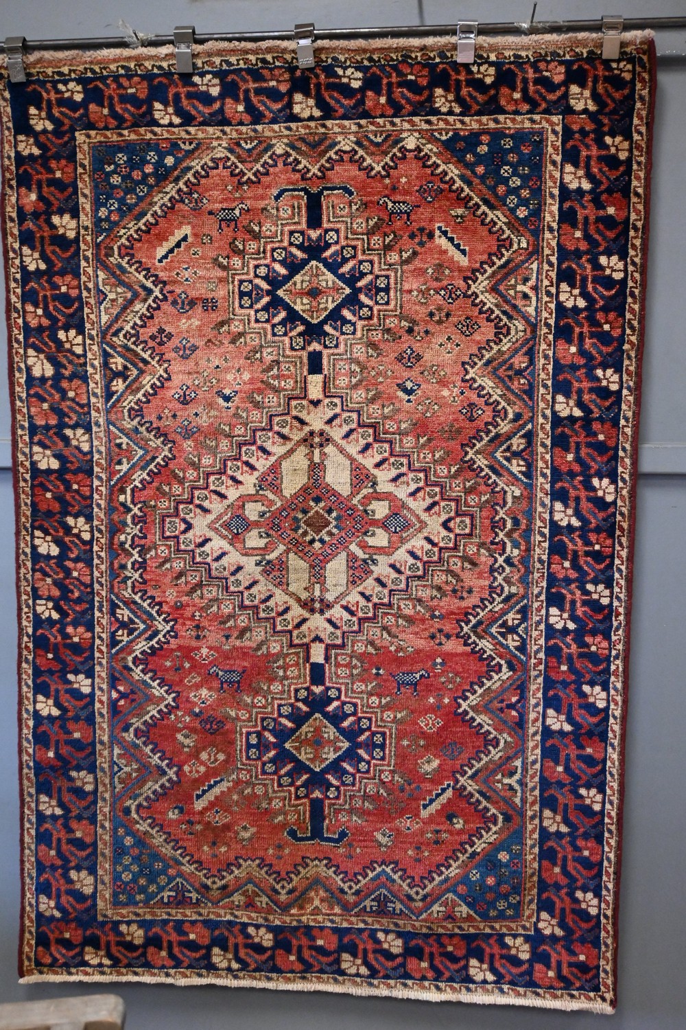 A TRIBAL PERSIAN SHIRAZ RUG, CIRCA 1950'S. 100% WOOL, HAND SPUN WOOL. HAND-KNOTTED VILLAGE WEAVE WITH TRIBAL DESIGN OF TRIPLE HOOKED DIAMOND MEDALLIONS CONTAINING AMULETS SET WITHIN A SOFT ROSE FIELD. ALL OVER TRIBAL MOTIFS & ANIMAL MOTIFS. SOME ABRASH. RESTORED TO GALLERY CONDITION. SIZE: 200 X 132 CM ORIGIN: PERSIA - RRP: $2,800 DOCUMENTATION OF AUTHENTICITY INCLUDED