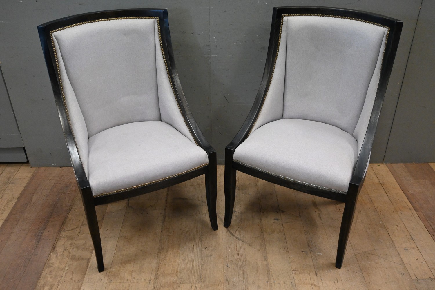 A PAIR OF CONTEMPORARY SIDE CHAIRS WITH STUDDED DETAILING (A/F) (102H X 60W X 64D CM) (LEONARD JOEL DELIVERY SIZE: LARGE)