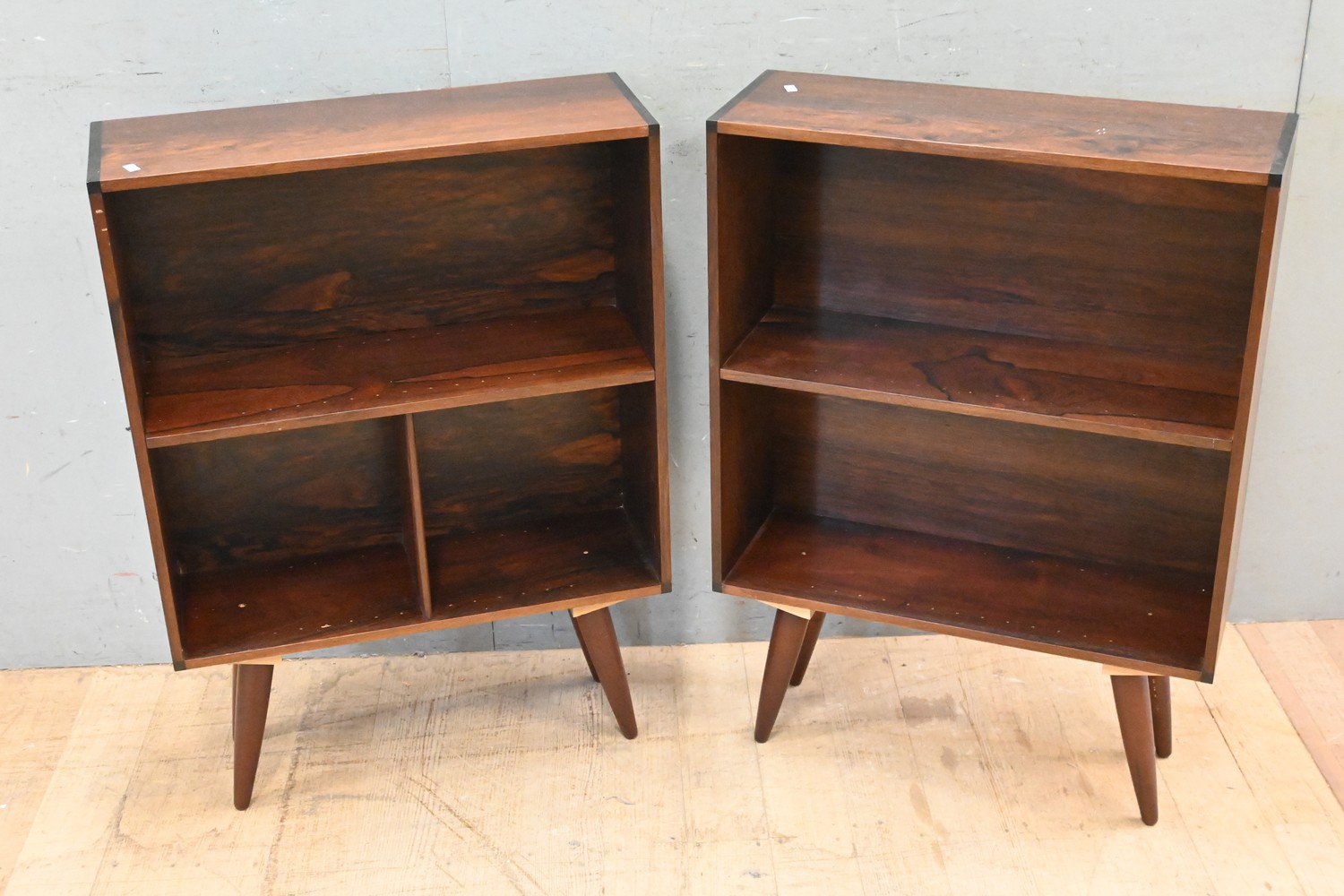 A PAIR OF MID-CENTURY DANISH ROSEWOOD CONVERTED CABINETS WITH MODERN LEGS (A/F) (90H X 64W X 22D CM) (LEONARD JOEL DELIVERY SIZE: LARGE)