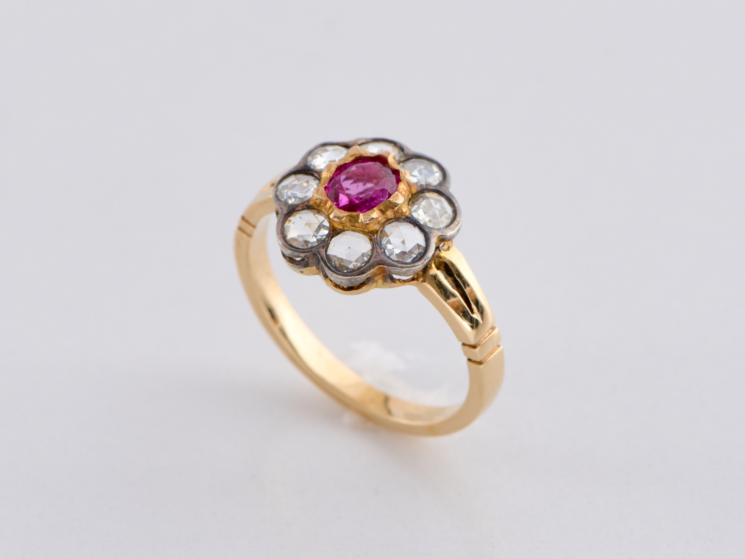 A BURMESE RUBY AND ROSE CUT DIAMOND SET RING IN 14CT GOLD AND SILVER, SIZE K, THE DIAMONDS VS CLARITY, 3.3GMS, WITH VALUATION