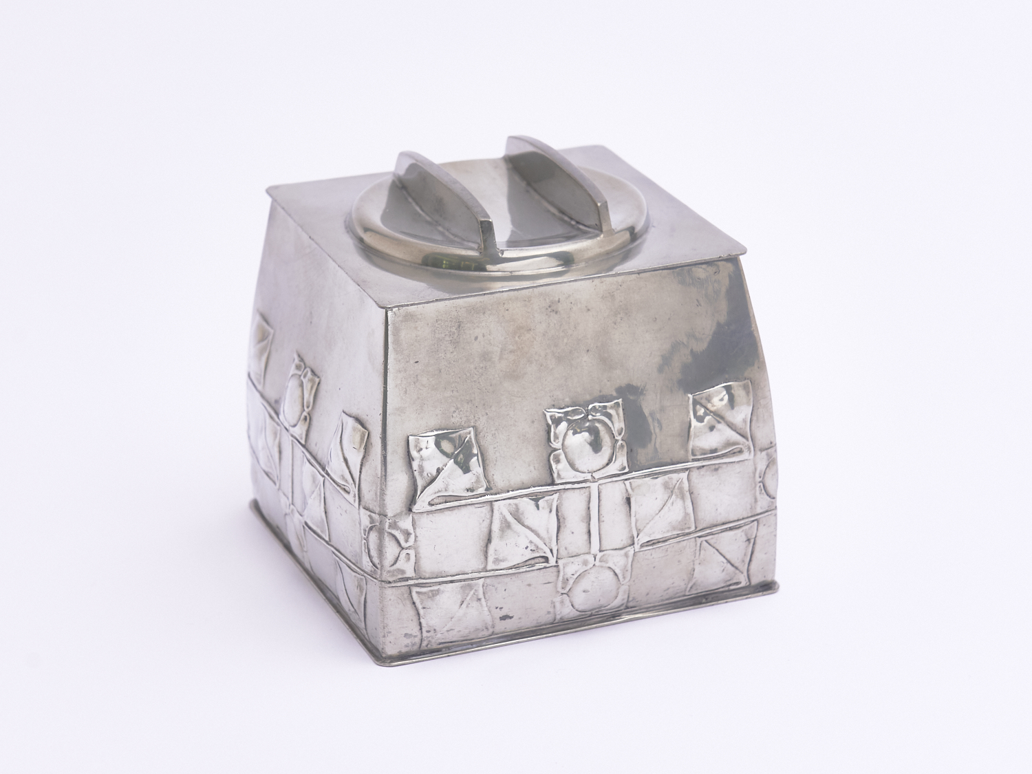 AN ARCHIBALD KNOX FOR LIBERTY AND CO "TUDRIC" PEWTER BISCUIT BOX CIRCA1903 H.15CM X W.14CM, LEONARD JOEL LOCAL DELIVERY: SMALL