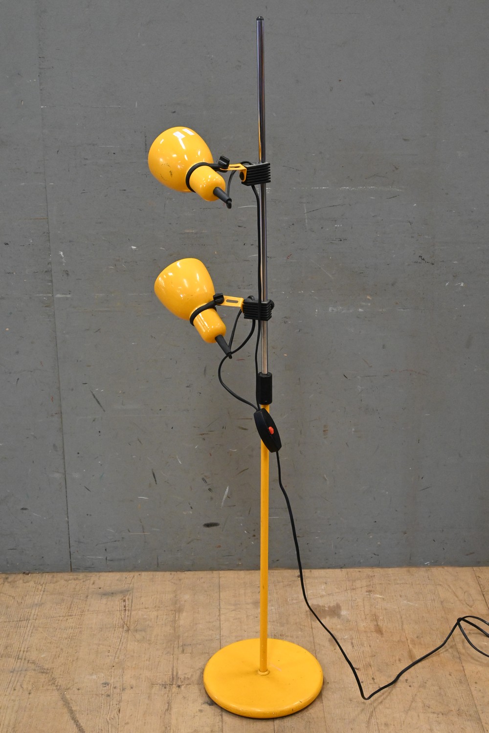 A 1970'S POP YELLOW TWIN HEAD STANDARD LAMP ( 140 CM H) (FOREIGN PLUG, UNTESTED) (LEONARD JOEL DELIVERY SIZE: MEDIUM)