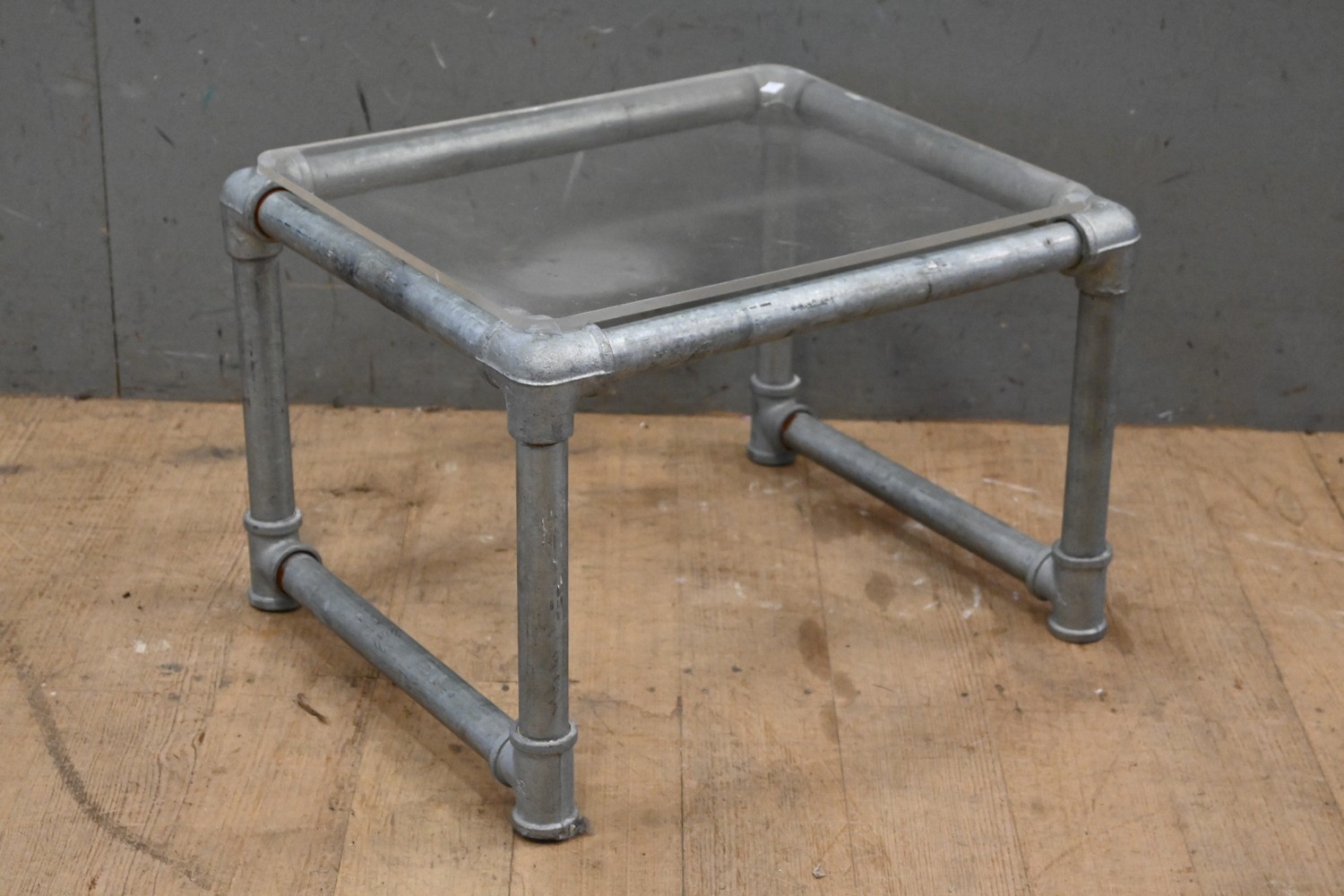A STEEL PIPE AND PERSPEX SIDE TABLE (A/F) (35H X 50W X 40D CM) (LEONARD JOEL DELIVERY SIZE: MEDIUM)