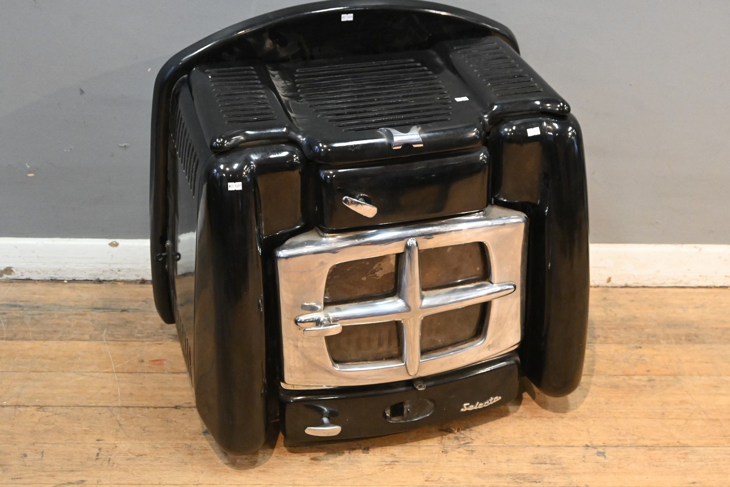 SUPERB 1940S ART DECO FRENCH ENAMELLED CAST IRON AND POLISHED STAINLESS STEEL WOODFIRED STOVE (A/F) (66H X 73W X 48D CM) (PLEASE NOTE THIS VERY HEAVY ITEM MUST BE REMOVED BY CLIENTS OR CARRIERS AT THE CUSTOMERS EXPENSE. LEONARD JOEL STAFF WILL NOT ASSIST CARRYING THIS ITEM)