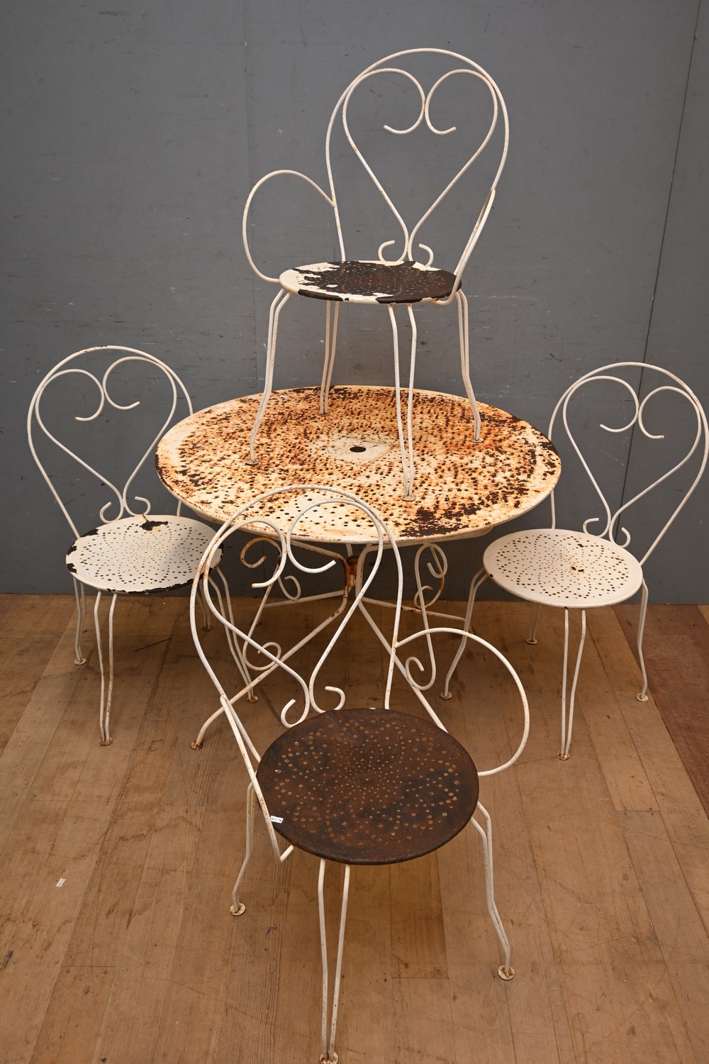 SUPERB 1900S FRENCH WHITE CAST IRON 5 PIECE PATIO SET COMPRISING 4 MATCHED CHAIRS AND CIRCULAR TABLE (74H X 97D CM) (LEONARD JOEL DELIVERY SIZE: LARGE)
