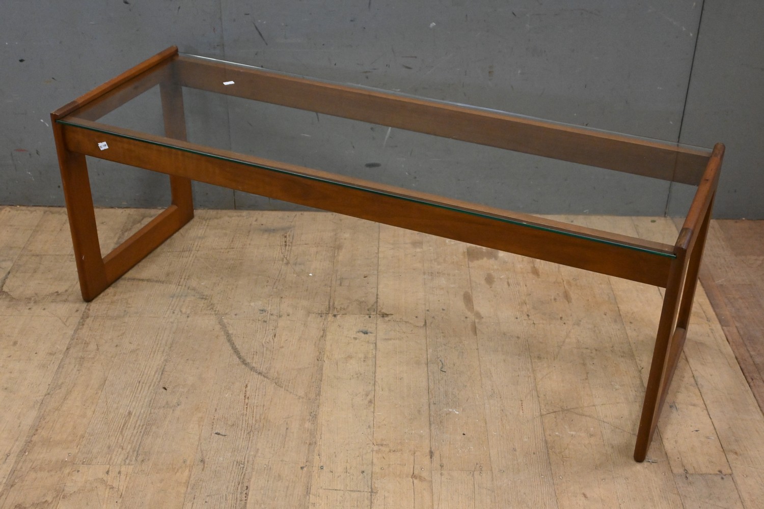 A RETRO AUSTRALIAN MADE RECTANGULAR TEAK COFFEE TABLE WITH GLASS TOP (46H X 126W X 43D CM) (LEONARD JOEL DELIVERY SIZE: LARGE)