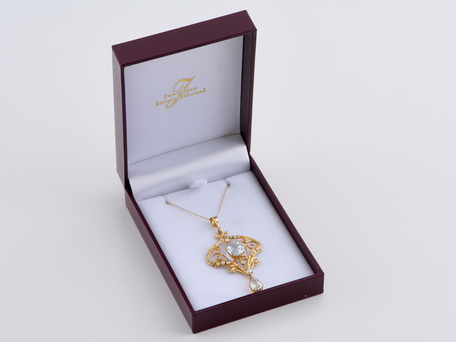 AN AQUAMARINE AND SEED PEARL PENDANT NECKLACE IN 15CT GOLD, WITH FINE CHAIN IN 14CT GOLD, 5.45GMS, BOXED
