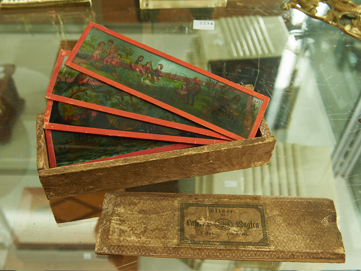 A GROUP OF GLASS MAGIC LANTERN SLIDES AND WOODEN BOX L.27CM, LEONARD JOEL LOCAL DELIVERY: SMALL