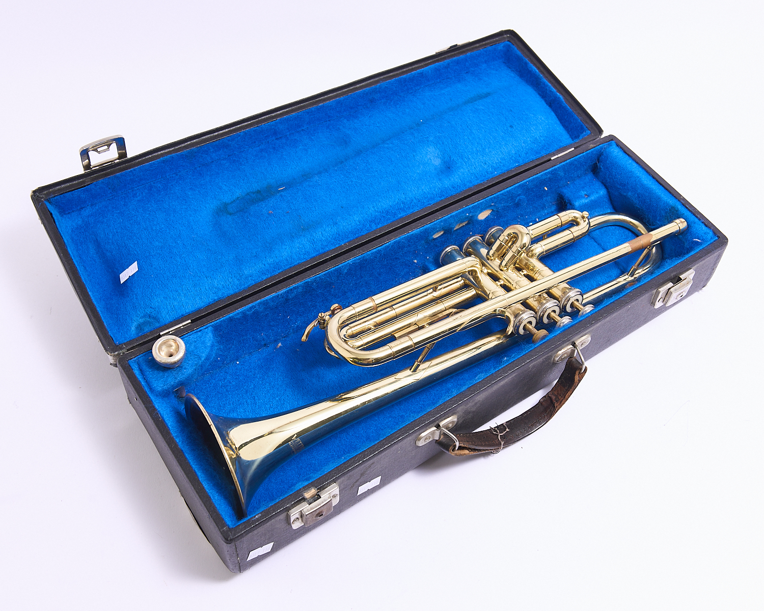 A BRASS TRUMPET WITH MOTHER OF PEARL KEYS L.53CM, LEONARD JOEL LOCAL DELIVERY: MEDIUM