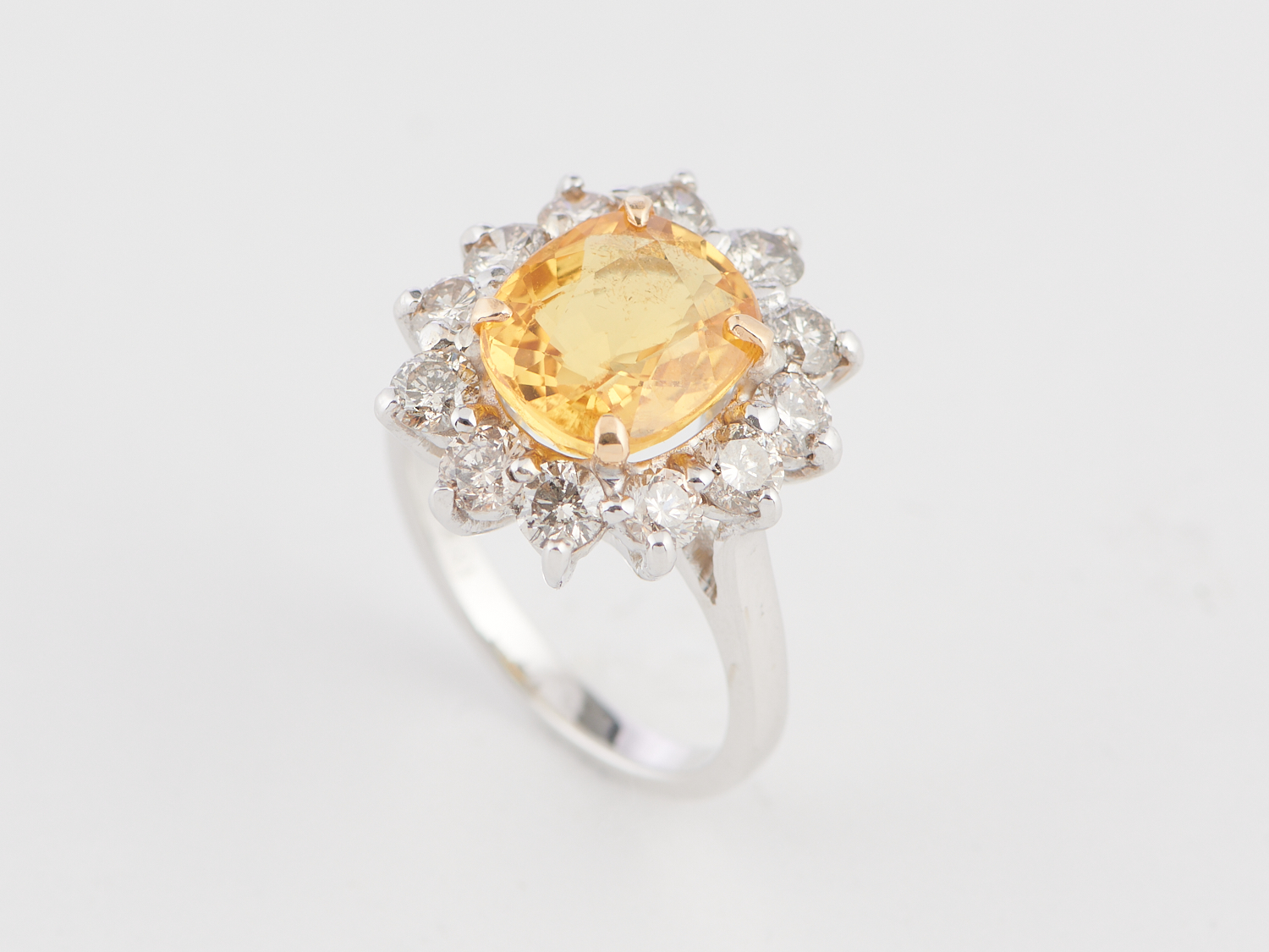 A YELLOW SAPPHIRE AND DIAMOND RING IN 18CT TWO TONE GOLD, THE SAPPHIRE WEIGHING 4.35CTS, THE DIAMONDS TOTALLING 1.45CTS, RING SIZE L