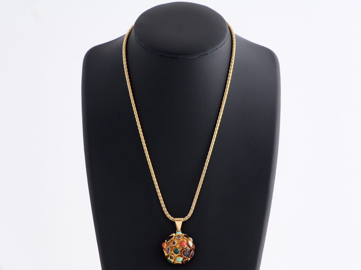 A MULTI-GEM SET BALL PENDANT IN 14CT GOLD, TO A CHAIN IN 9CT GOLD, LENGTH 490MM, TOTAL WEIGHT APPROXIMATELY 33.46GMS