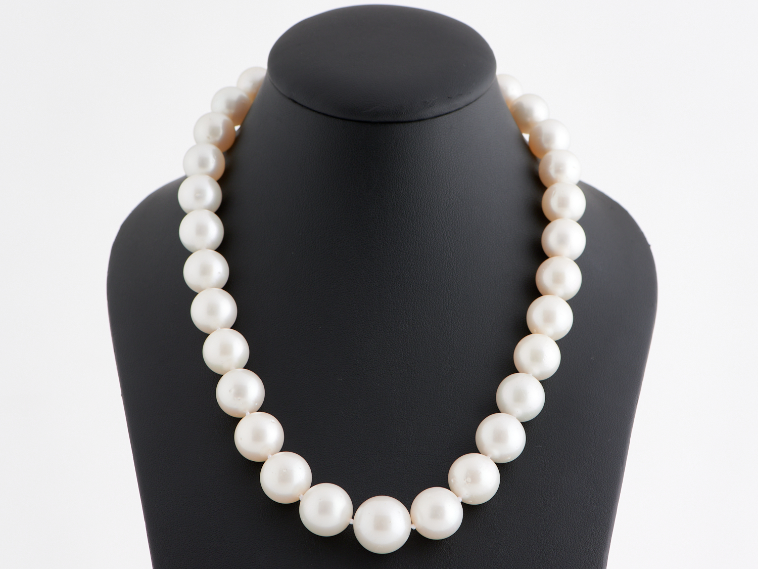 A STRAND OF SOUTH SEA PEARLS TO A CLASP IN 14CT WHITE GOLD, THE PEARLS MEASURING 16.9-13.2MM, LENGTH 480MM