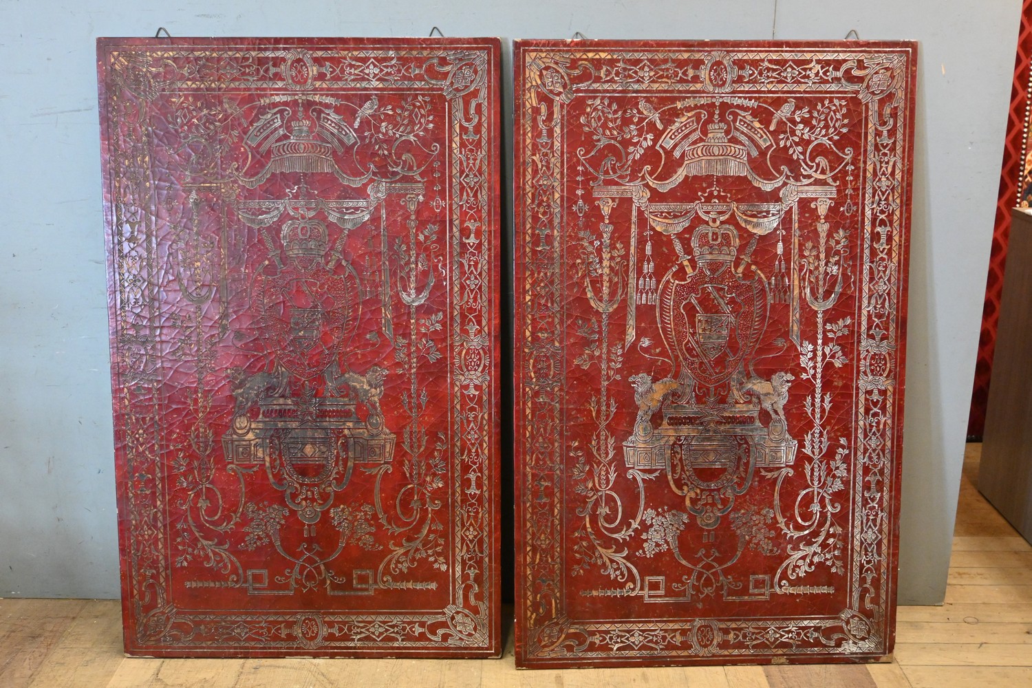 A PAIR OF LARGE SOUTH EAST ASIAN LACQUERED PANELS BEARING A COAT OF ARMS (164H X 102W CM) (LEONARD JOEL DELIVERY SIZE: LARGE)