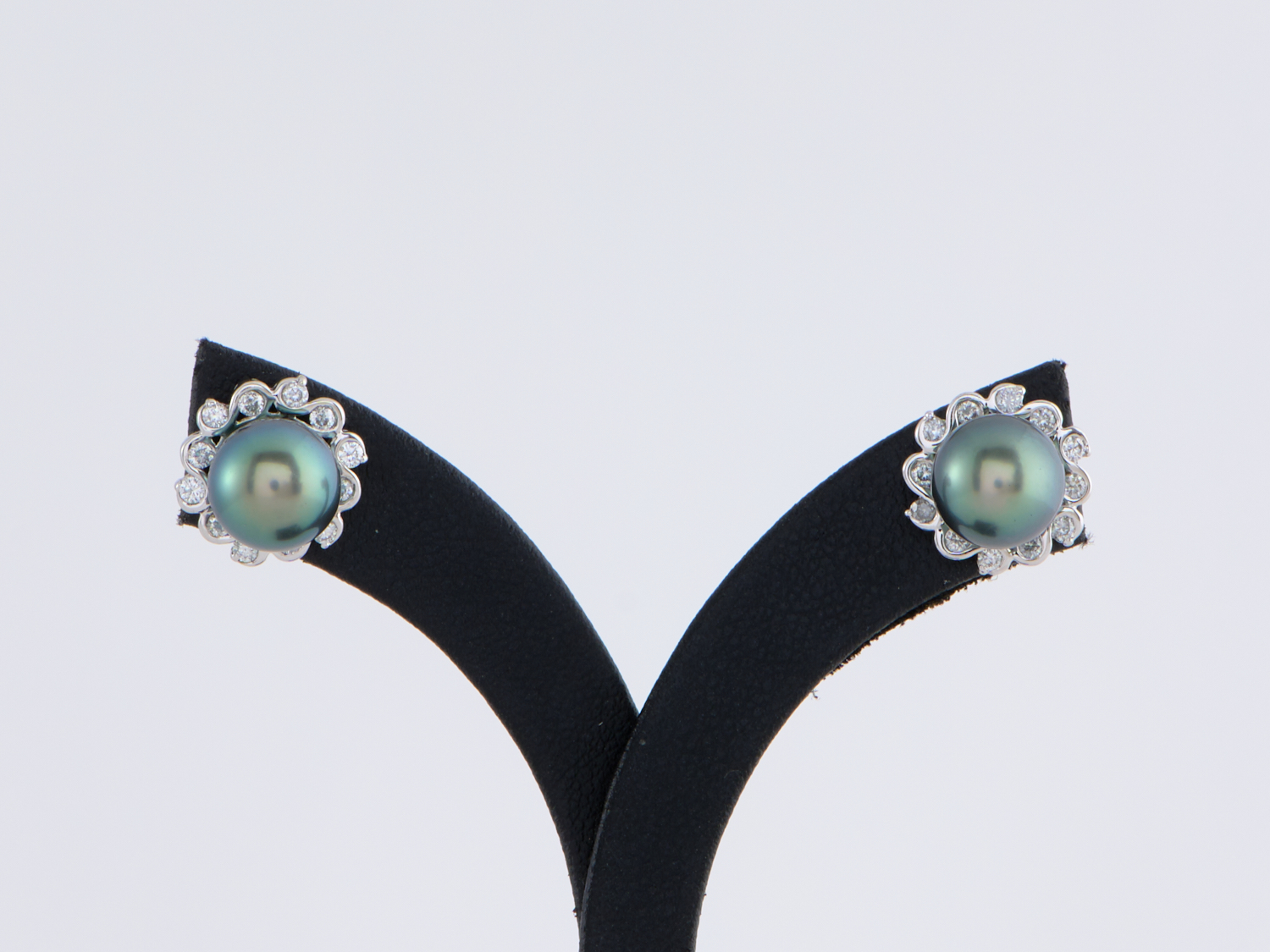 A PAIR OF TAHITIAN PEARL AND DIAMOND EARRINGS IN 18CT WHITE GOLD, THE PEARLS MEASURING APPROXIMATELY 9MM, TO POST AND BUTTERFLY FITTINGS