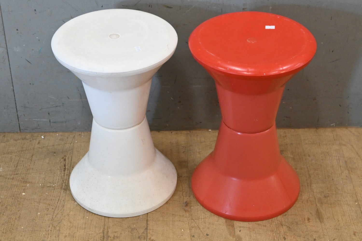 A PAIR OF MID CENTURY RED AND WHITE CAROMA STOOLS (A/F) (44H X 30D CM) (LEONARD JOEL DELIVERY SIZE: MEIDUM)