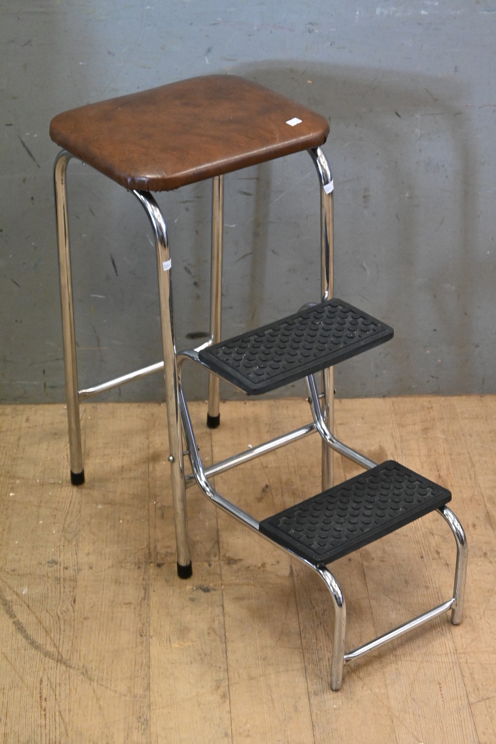 A MID CENTURY CHROME STEP UP STOOL (65H X 35W X 65D CM) (LEONARD JOEL DELIVERY SIZE: MEDIUM)