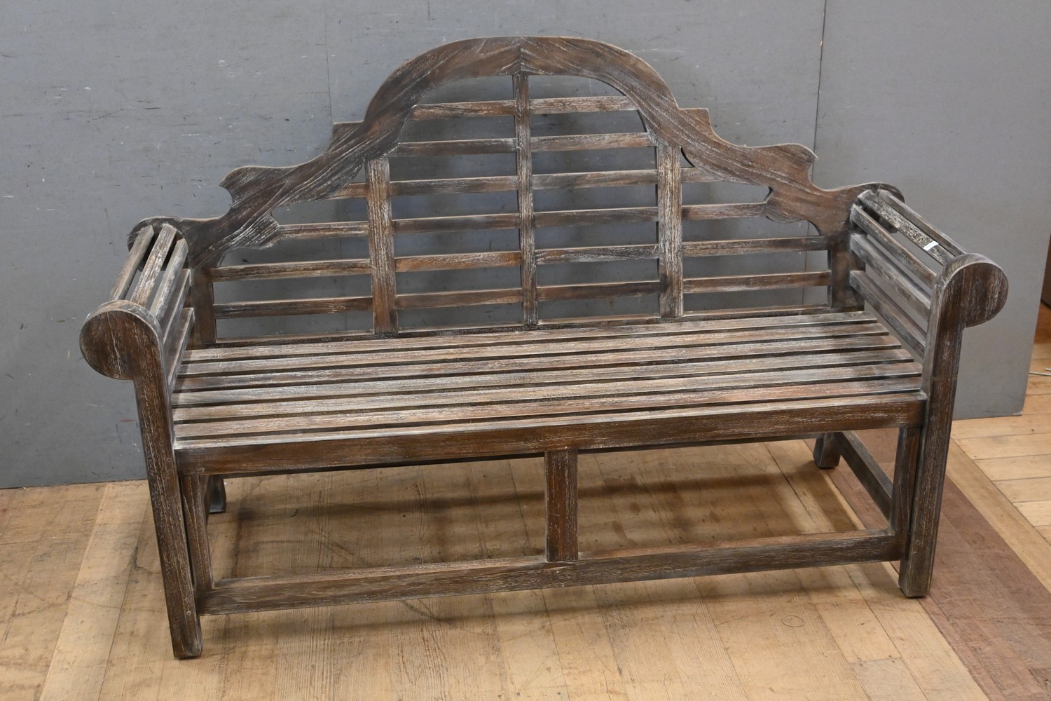 A LUTYENS TEAK BENCH SEAT IN GREY WASH FINISH (105H X 170W X 60D CM) (LEONARD JOEL DELIVERY SIZE: X-LARGE)