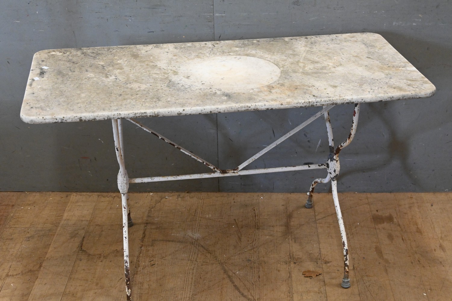 A FRENCH MARBLE AND IRON BISTRO TABLE (A/F) (70H X 115W X 54D CM) (LEONARD JOEL DELIVERY SIZE: X-LARGE)