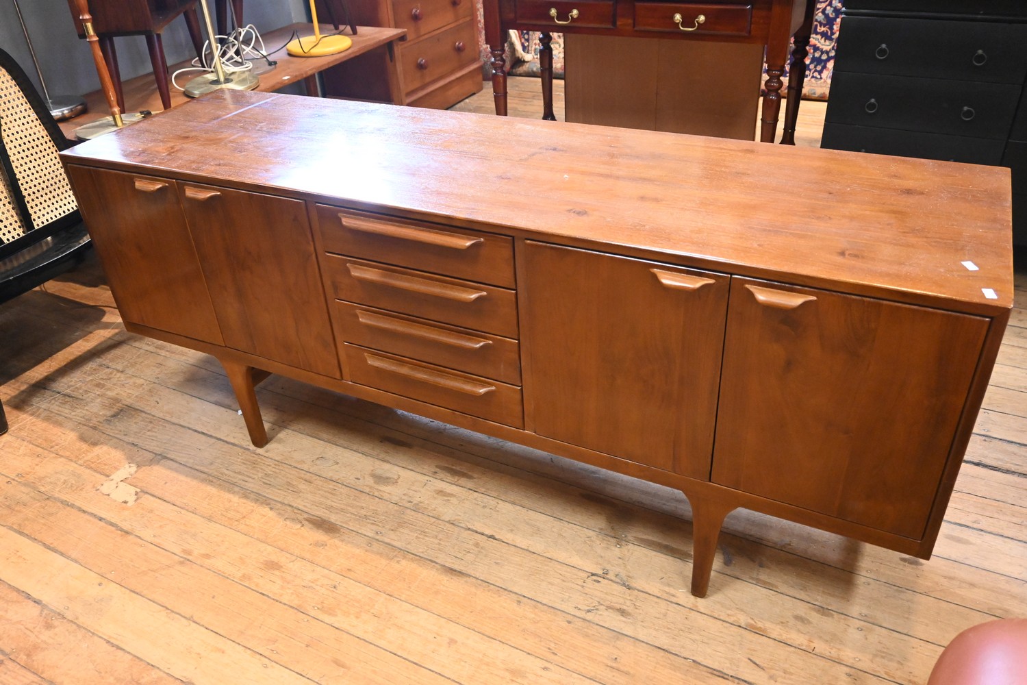 A MID CENTURY STYLE LOW RISE TEAK SIDEBOARD (72H X 181W X 51D CM) (PLEASE NOTE THIS HEAVY ITEM MUST BE REMOVED BY CLIENTS OR CARRIERS AT THE CUSTOMERS EXPENSE. LEONARD JOEL STAFF CANNOT ASSIST CARRYING THIS ITEM)