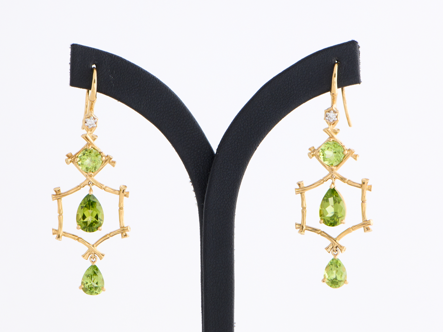 A PAIR OF PERIDOT AND DIAMOND CHANDELIER EARRINGS IN 18CT GOLD, RETAILED BY BERGDORF GOODMAN, 9.6GMS
