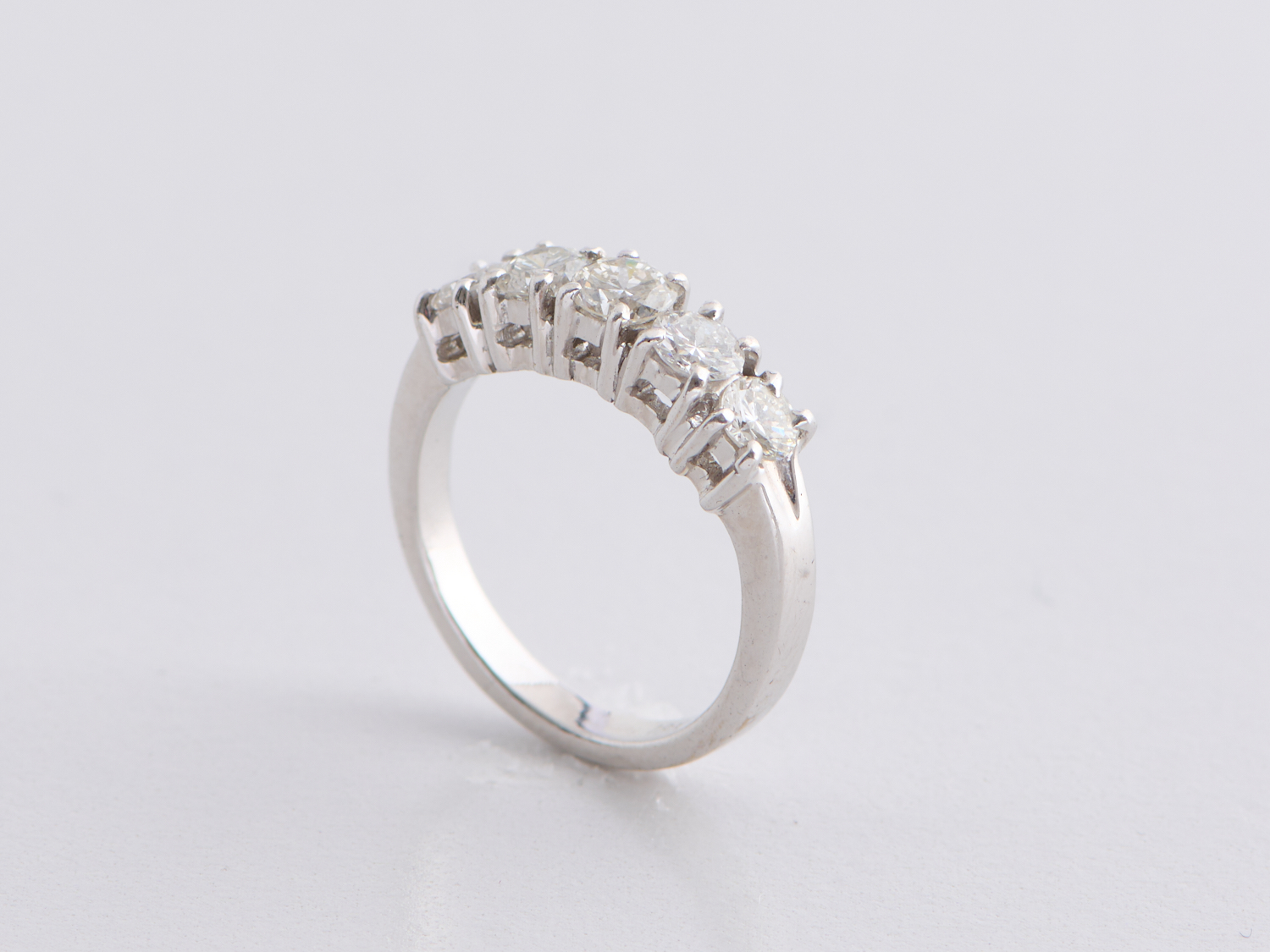 A FIVE STONE DIAMOND RING IN 18CT WHITE GOLD, COMPRISING FIVE CLAW-SET ROUND BRILLIANT-CUT DIAMONDS TOTALLING 1.45 CARATS, RING SIZE M, 5.2GMS