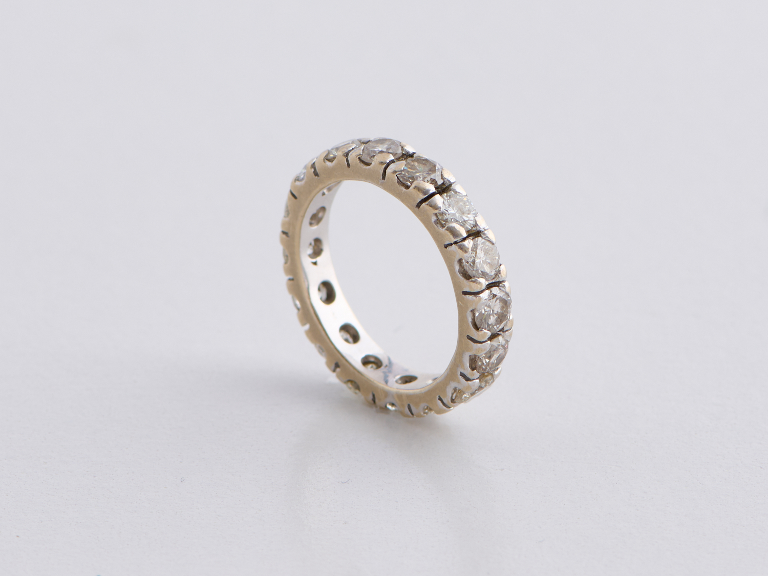 A CLAW SET DIAMOND ETERNITY RING IN 18CT WHITE GOLD, RING SIZE M/N, 5.0GMS