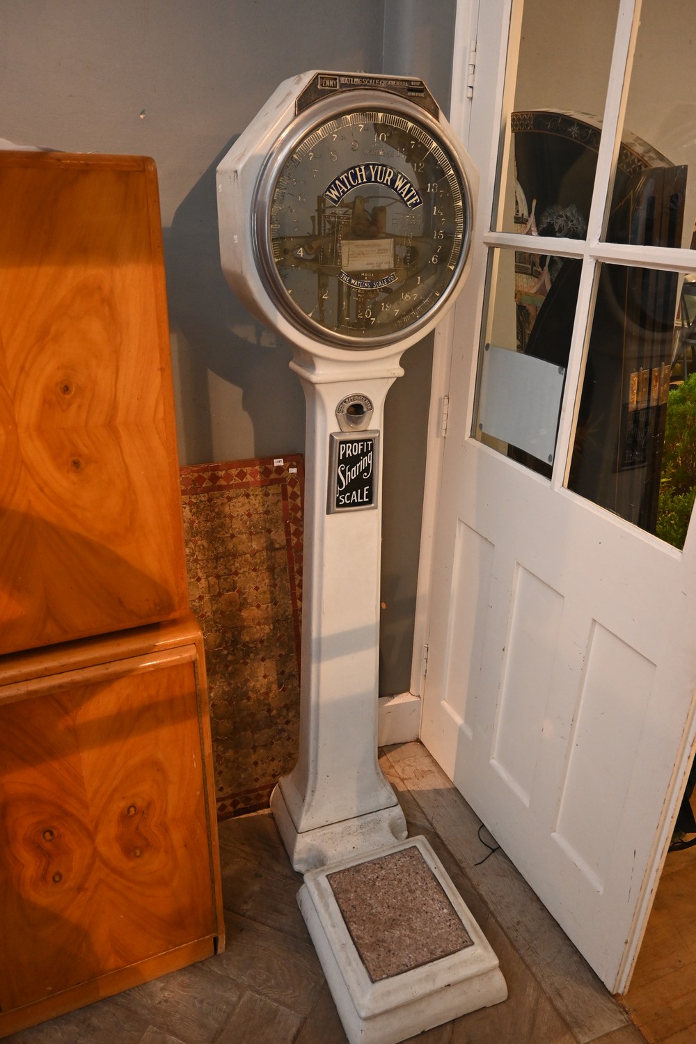 AN ANTIQUE SET OF SCALES (A/F) (182H X 49W X 72D CM) (PLEASE NOTE THIS HEAVY ITEM MUST BE REMOVED BY CLIENTS OR CARRIERS AT THE CUSTOMERS EXPENSE. LEONARD JOEL STAFF CANNOT ASSIST CARRYING THIS ITEM)