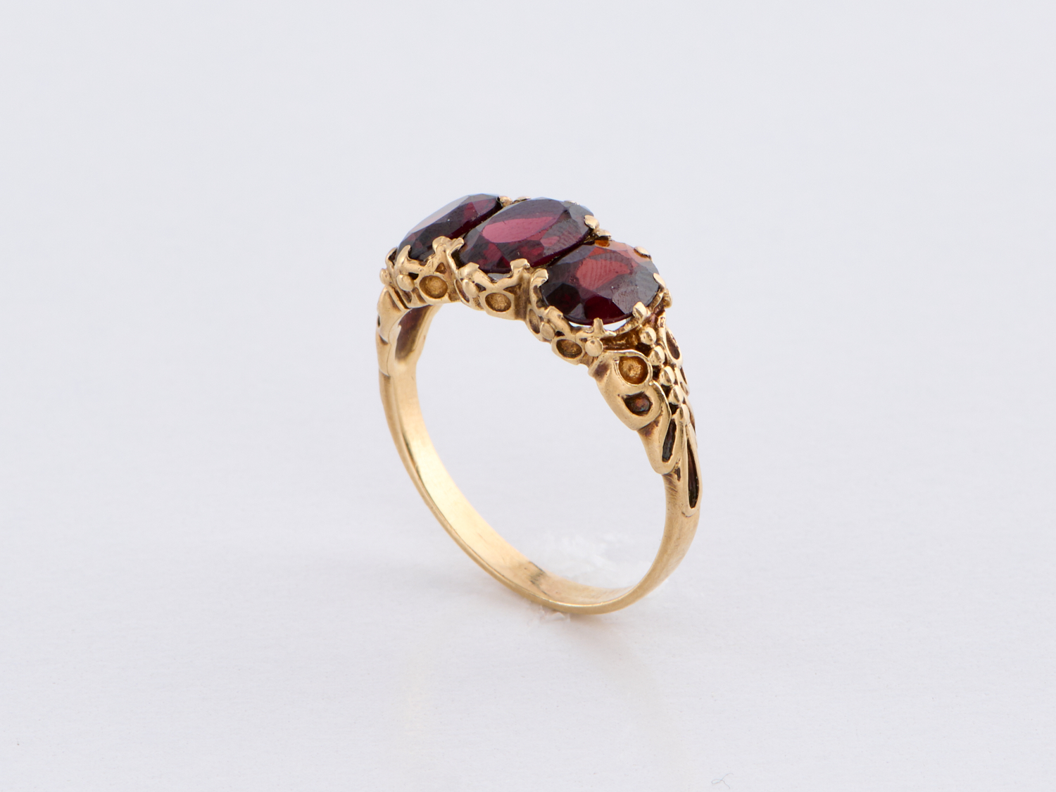 A GARNET SET RING IN 9CT GOLD, RING SIZE P, 3.09GMS