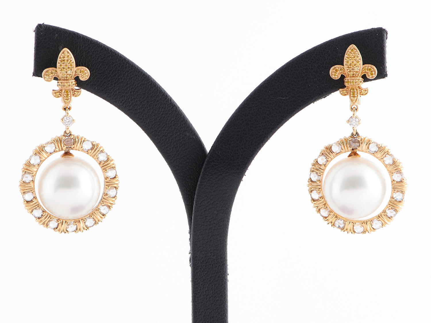 A PAIR OF SOUTH SEA PEARL, YELLOW AND COLOURLESS DIAMOND EARRINGS IN 18CT GOLD BY AUTORE, THE PEARLS MEASURING 12MM, THE DIAMONDS TOTALLING 0.19CTS, TO EUROPEAN HOOK FITTINGS, SIGNED, LENGTH 40MM