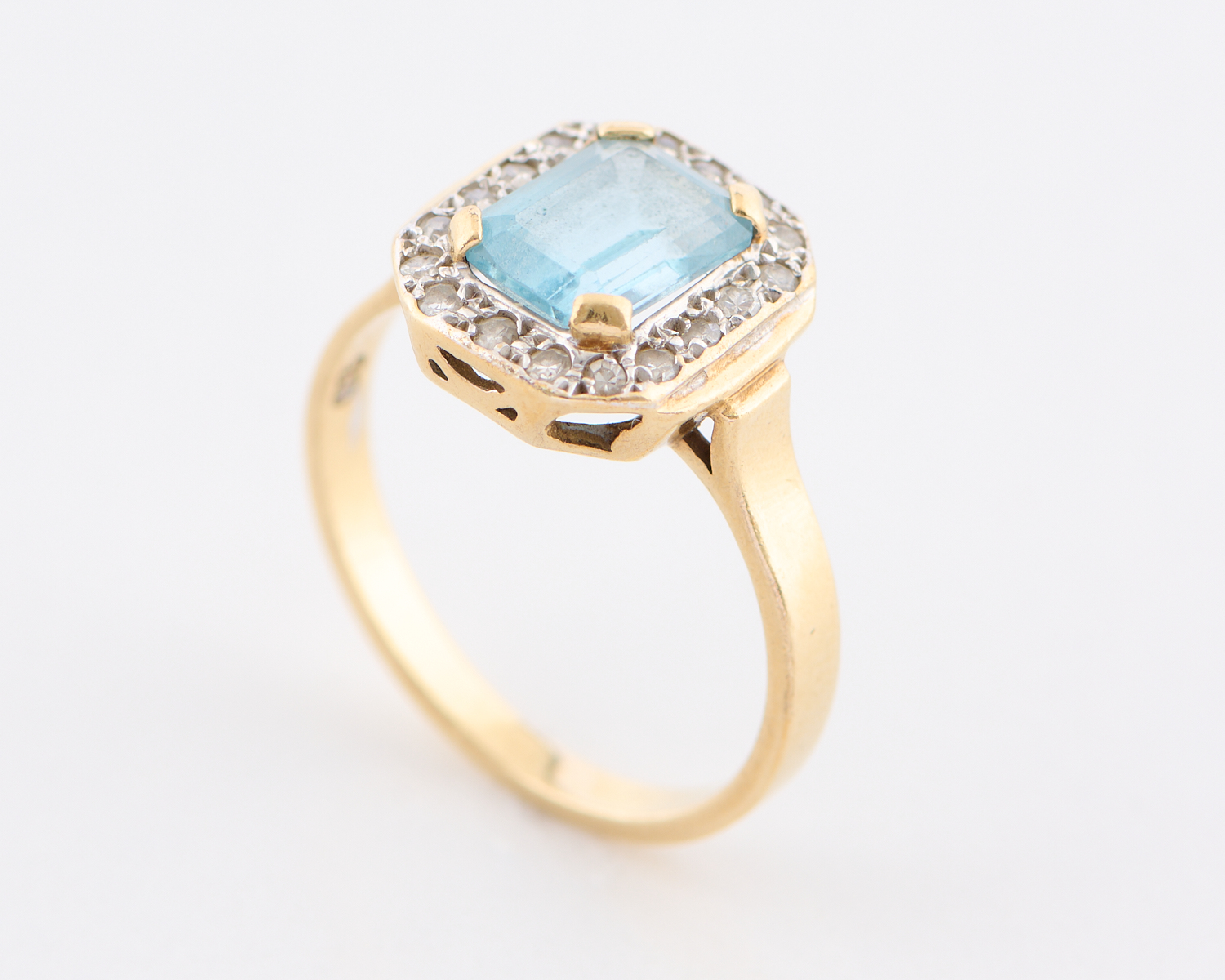 AN AQUAMARINE AND DIAMOND RING IN 9CT GOLD, RING SIZE N, 2.99GMS