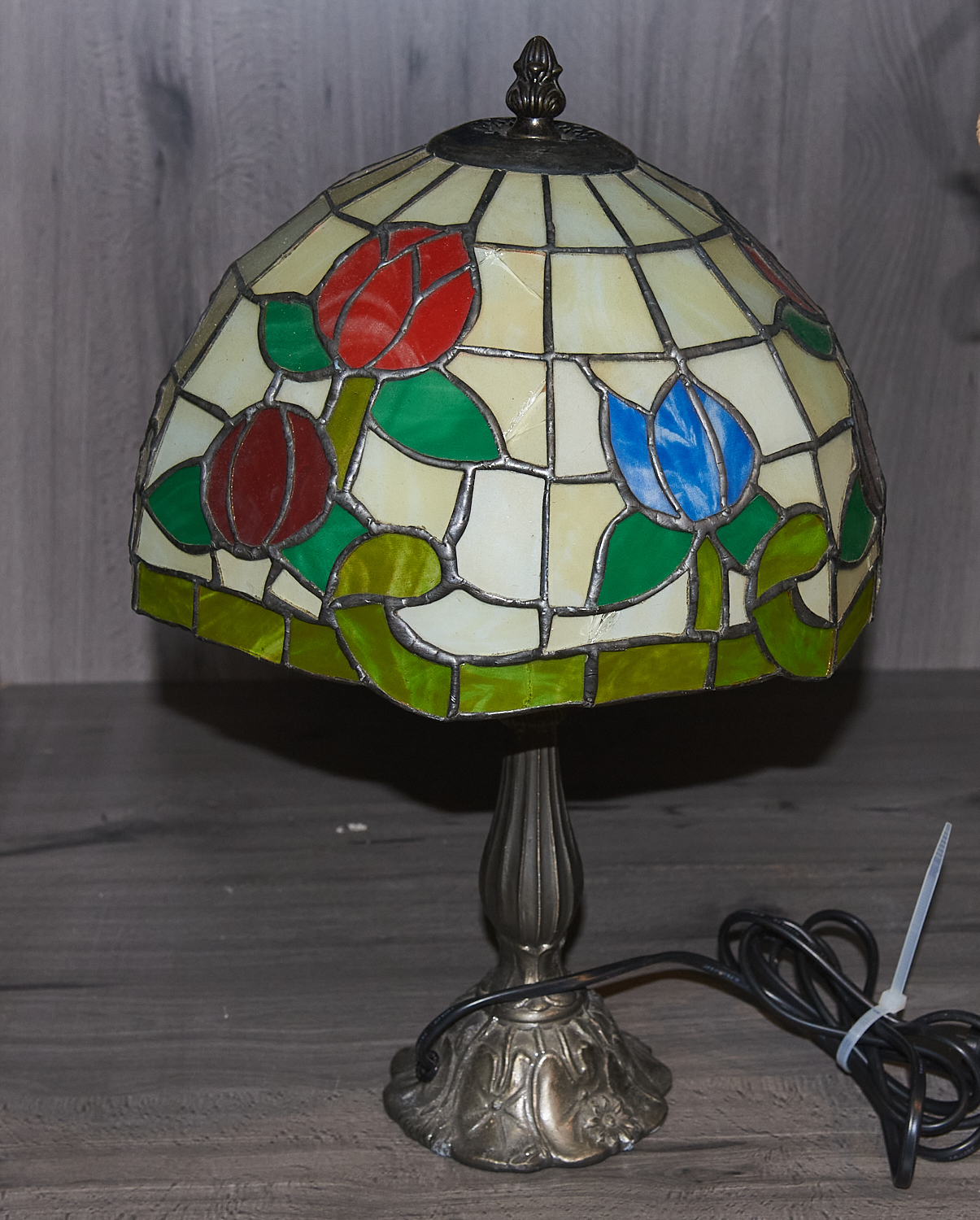 A TIFFANY STYLE LAMP (A/F CRACKS TO SHADE), LEONARD JOEL LOCAL DELIVERY: MEDIUM