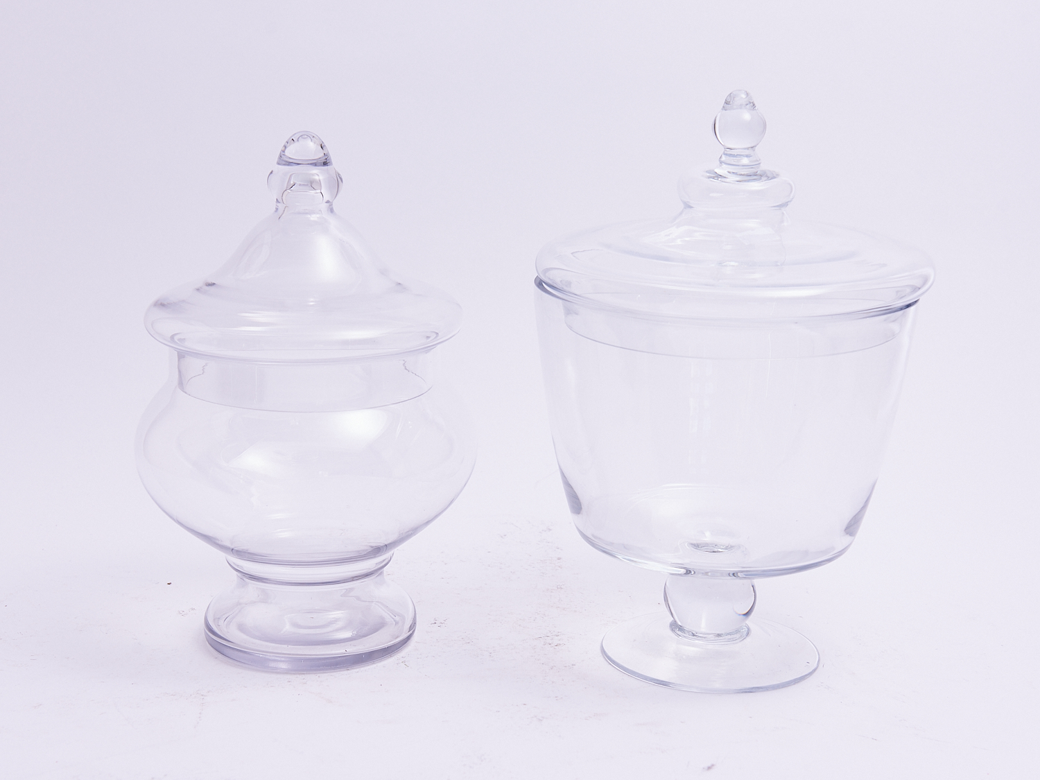TWO CLEAR GLASS LIDDED BOWLS (TALLEST - H34 CM), LEONARD JOEL LOCAL DELIVERY: MEDIUM