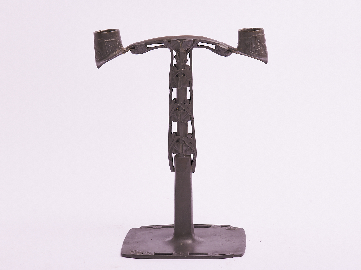 AN ARCHIBALD KNOX ARTS AND CRAFTS "TUDRIC" PEWTER CANDELABRA FOR LIBERTY AND CO, LEONARD JOEL LOCAL DELIVERY: SMALL