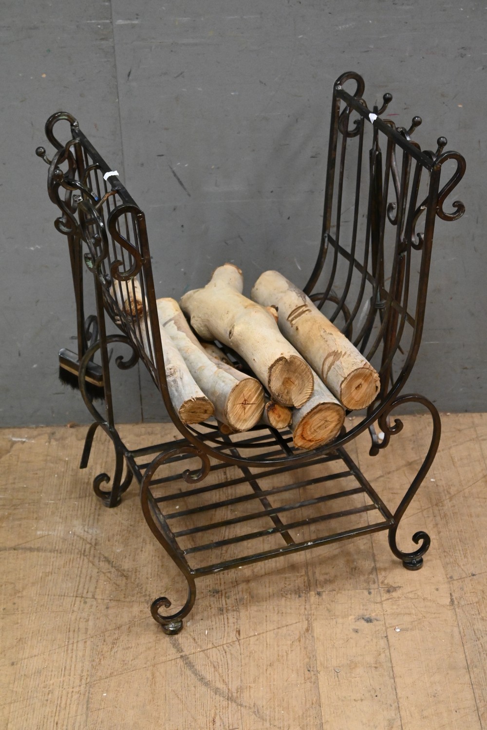 A METAL WOOD BASKET WITH FIRE TOOLS (70H X 53W X 33D CM) (LEONARD JOEL DELIVERY SIZE: LARGE)
