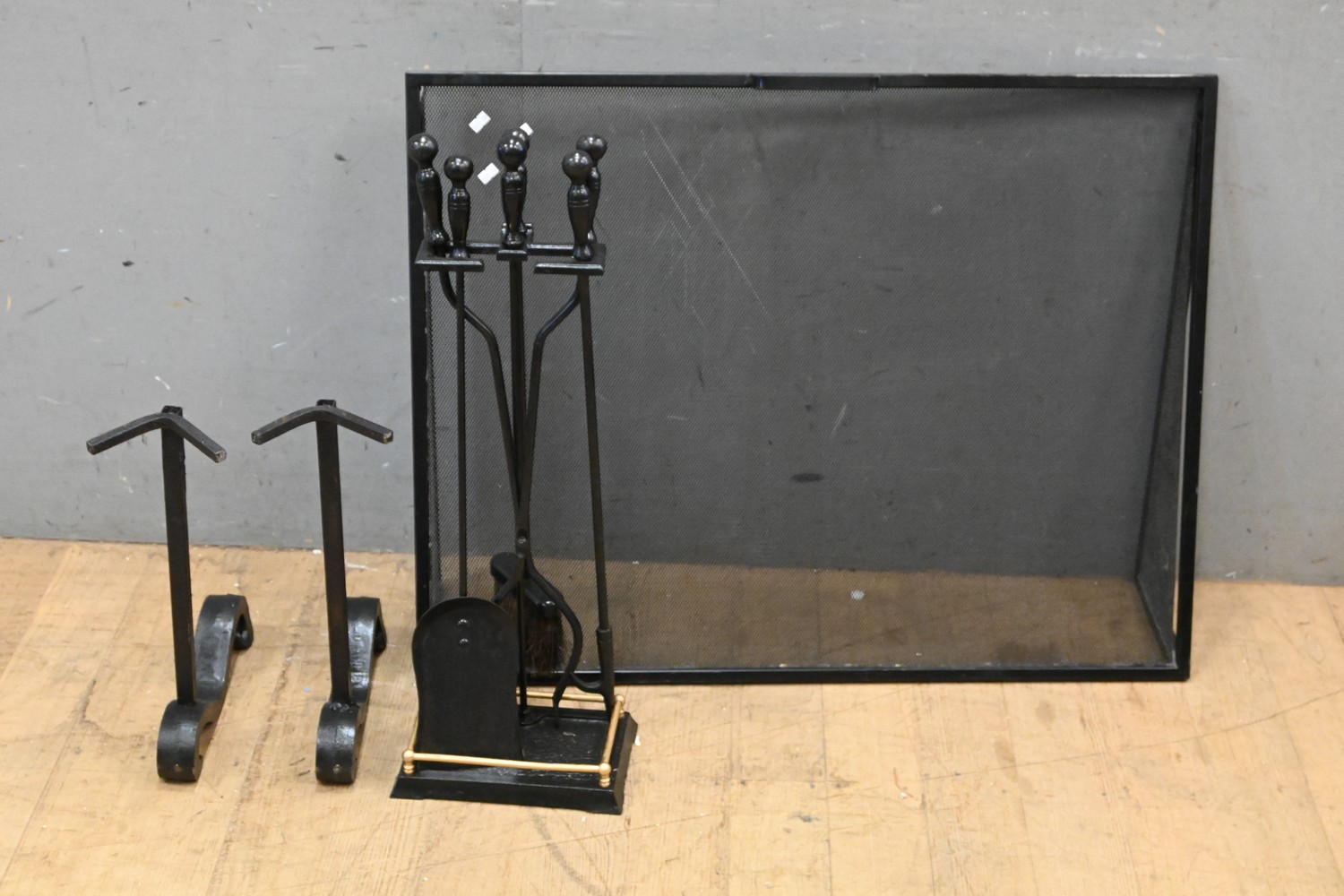 A METAL FIRE GUARD, TWO FIRE DOGS AND A SET OF FIRE TOOLS (GUARD 73H X 92W X 23D CM) (LEONARD JOEL DELIVERY SIZE: MEDIUM)
