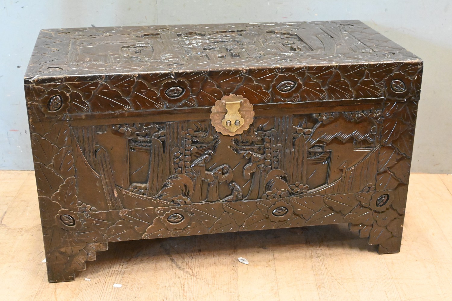 A CARVED CAMPHOR WOOD CHEST (A/F) (59H X 102W X 50D CM) (LEONARD JOEL DELIVERY SIZE: X-LARGE)