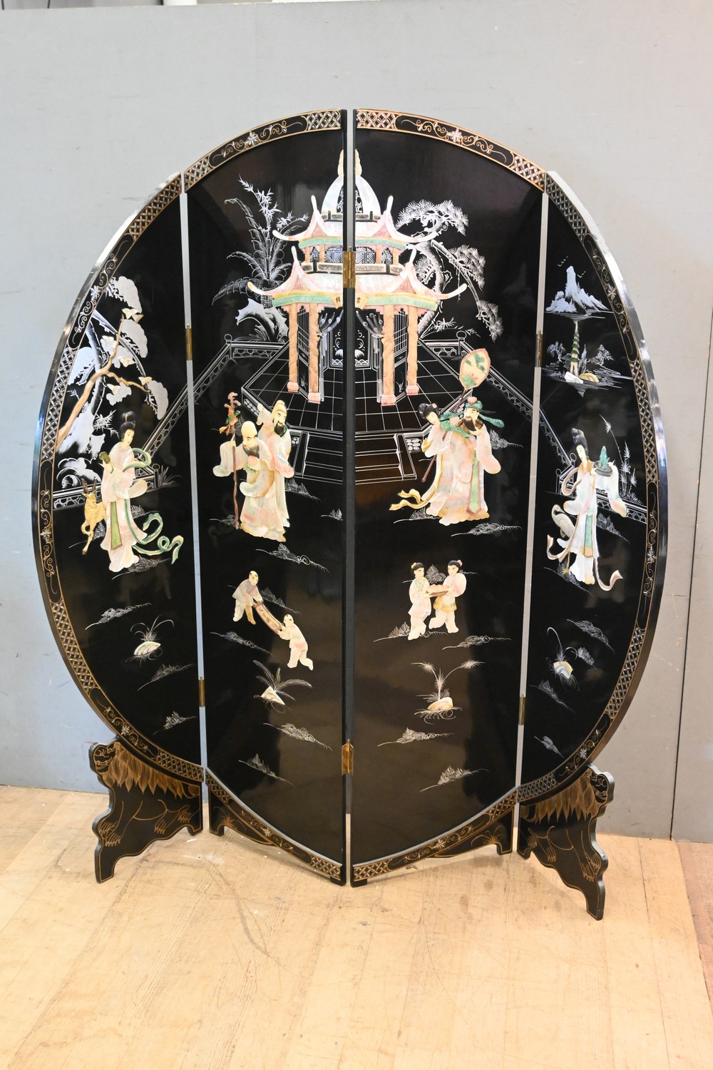 A CHINESE DECORATIVE FOUR PANEL PRIVACY SCREEN WITH MOTHER OF PEARL INLAY (183H X 46W CM PER PANEL) (LEONARD JOEL DELIVERY SIZE: X-LARGE)