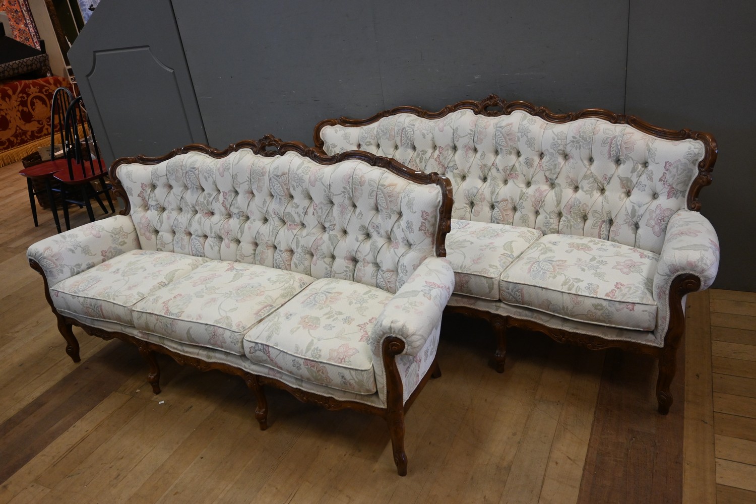A PAIR OF ROCCOCO STYLE BUTTON BACK SOFAS (A/F) (9H X 197W X 74D CM) (PLEASE NOTE THIS HEAVY ITEM MUST BE REMOVED BY CLIENTS OR CARRIERS AT THE CUSTOMERS EXPENSE. LEONARD JOEL STAFF CANNOT ASSIST CARRYING THIS ITEM)