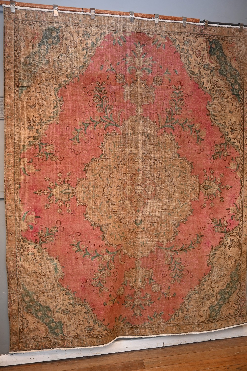 AN ATTRACTIVE VINTAGE OVER-DYED PERSIAN TABRIZ CARPET, VINTAGE PILE. A UNIQUE MODERN CARPET CREATED FROM AN AUTHENTIC VINTAGE ALL-OVER DESIGN TABRIZ CARPET WITH THE PILE SHORN AND OVER-DYED IN POMEGRANATE RED, TEAL GREEN & TAUPE TONES. GALLERY EXHIBITED. SIZE: 296 X 224 CM ORIGIN: PERSIA - RRP: $6,900 DOCUMENTATION OF AUTHENTICITY INCLUDED