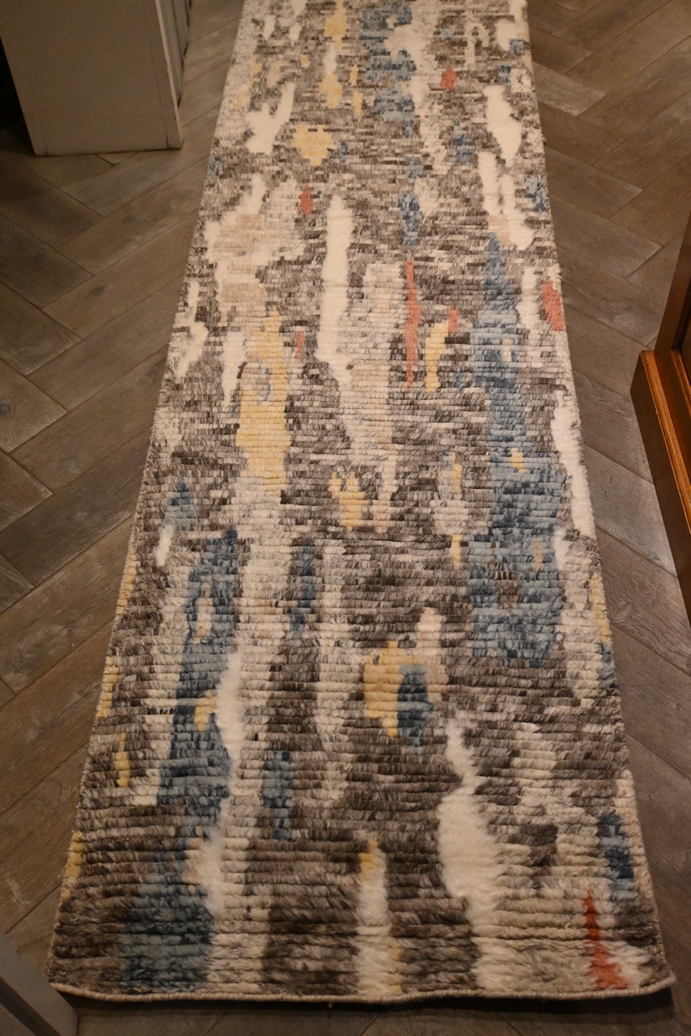 A BRAND-NEW MOROCCAN BERBER RUNNER. 100% WOOL PLUSH PILE, HANDLOOMED IN MULTI COLOUR TONES. SIZE: 490 X 83 CM ORIGIN: INDIA - RRP: $2,200